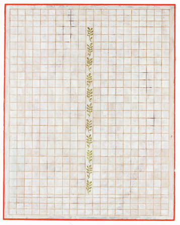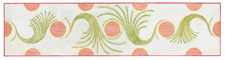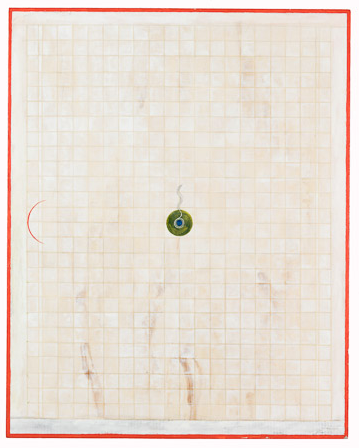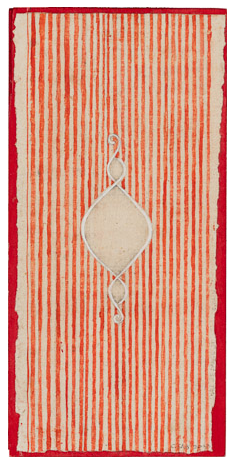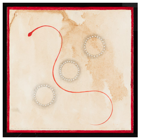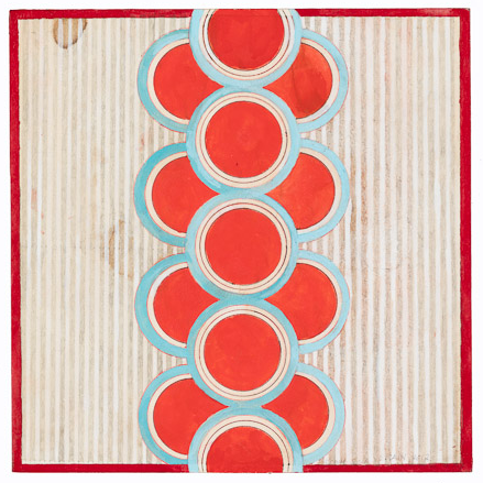Line Field 102, Red Circles with Frond and White Lines, Gouache and graphite on paper on Luan plyboard, 28.5 x 22.7 2013, Charlotte Cain