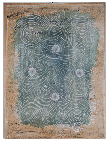 Untitled [waves, circles], Gouache on paper on digital print laminated to Baltic birch, 20.85" x 15.6," 2003c , signed C. Cain